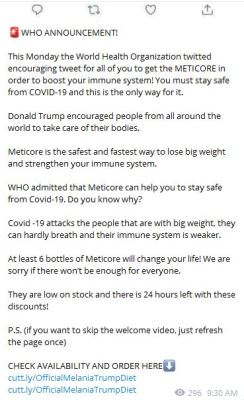 Using the World Health Organization as Via Telegram Social Media. Famous Actor Mel Gibson ( https://t.me/MelGibsonOfficial), is promoting Meticore Diet Weight Loss Supplement that a TOTAL SCAM!