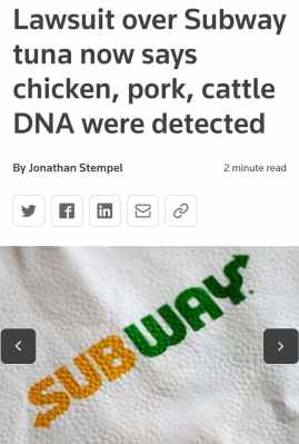 Subway Lawsuit – Tuna now says chicken, pork, cattle DNA were detected