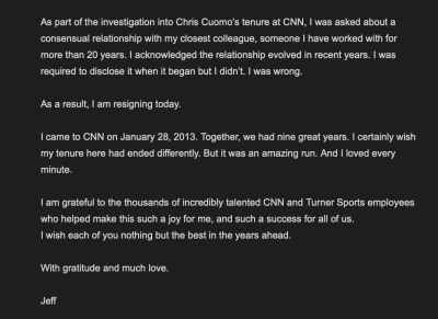 Zucker says he is resigning after he failed to disclose a romantic relationship with another CNN executive.